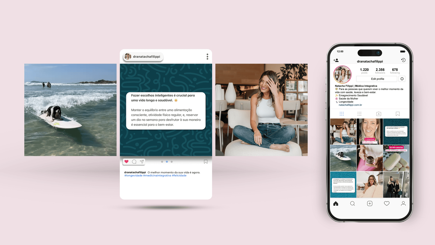Com o compromisso de focar na longevidade e no bem-estar completo, a marca da Dra. Natacha Filippi precisava se destacar, comunicando ao público de forma autêntica e impactante. A Dra. Natacha é uma das poucas profissionais que tem como foco principal o público feminino, especialmente em um campo ainda pouco conhecido, a medicina integrativa